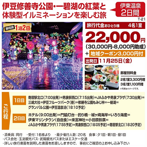 【全国旅行支援】伊豆修善寺公園・一碧湖の紅葉と体験型イルミネーションを楽しむ旅