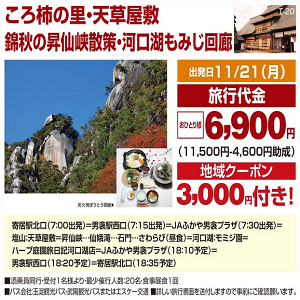 【全国旅行支援】ころ柿の里・天草屋敷 錦秋の昇仙峡探索・河口湖もみじ回廊